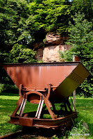 Im Bild ist eine historische Lore zu sehen, wie sie in den Eberbacher Steinbrüchen früher genutzt wurde; sie ist heute vor dem alten Steinbruch am Schneckenweg aufgestellt.
